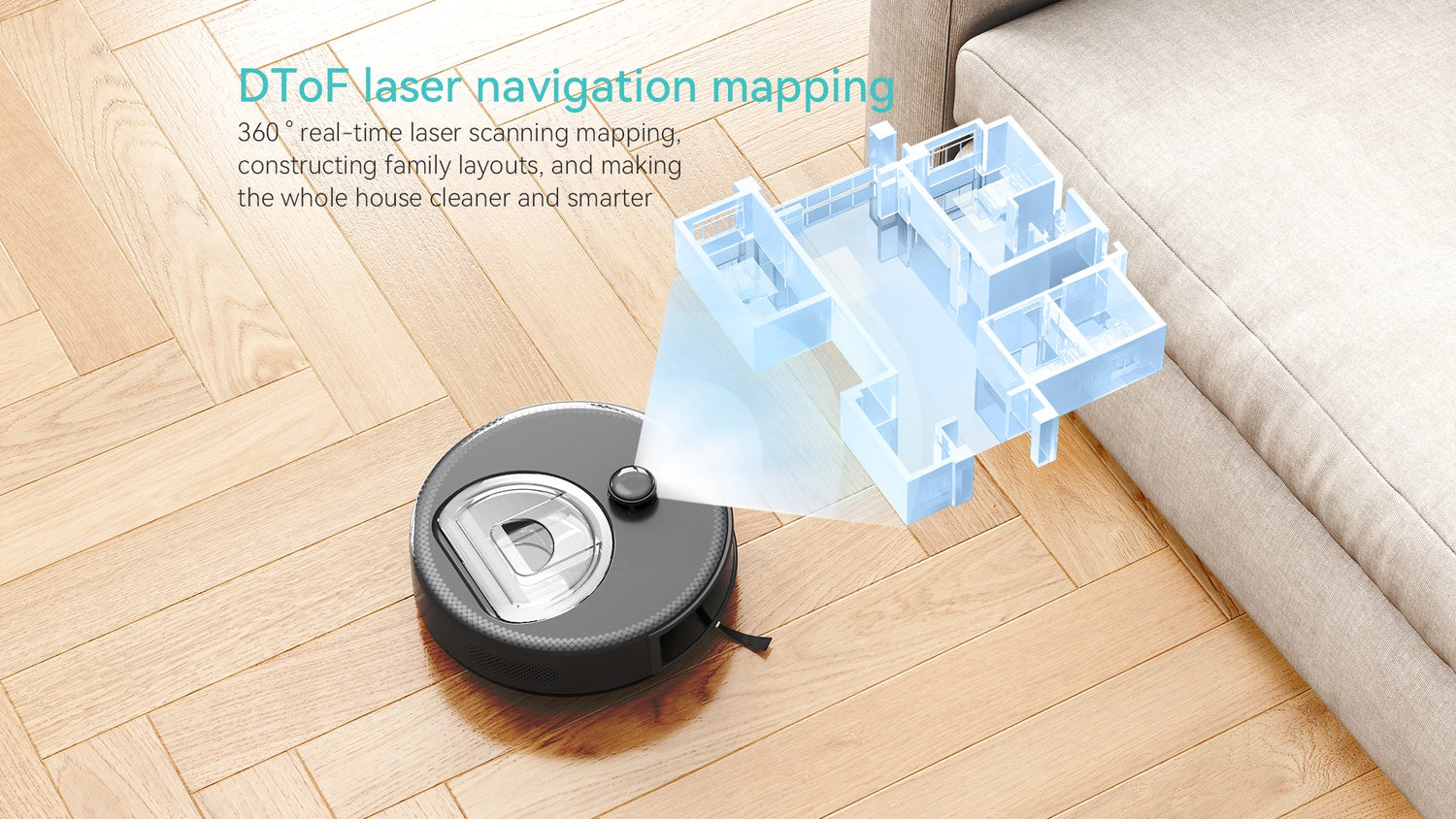 ใdToF LidarใPrecise mapping with the ability to store three maps, switch between maps for cleaning tasks at any time, and define limited areas for cleaning.