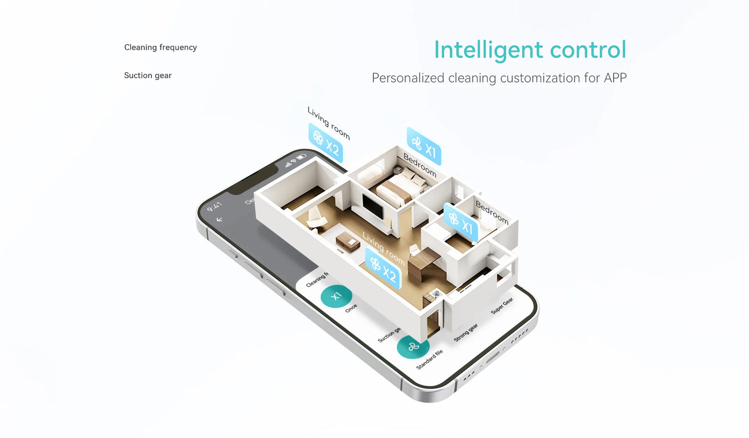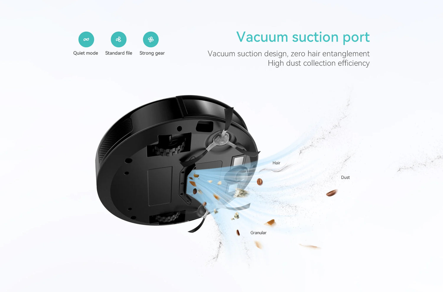 ใ4 Cleaning ModesใThe robot vacuum cleaner can flexibly switch between different modes via the APP: organized cleaning'Random cleaning'Spot cleaning' Cleaning along the wall' .Switch freely between different modes and 3 levels of suction power as you want through the app.