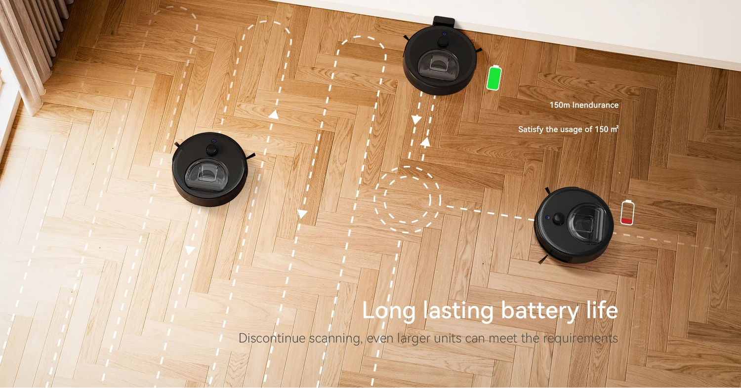 ใAutomatic Chargingใ: The M330 can run for up to 150 minutes on a single charge (in silent mode). When the cleaning task is completed or the battery is only 15% left, the robot will automatically return to the charging station.